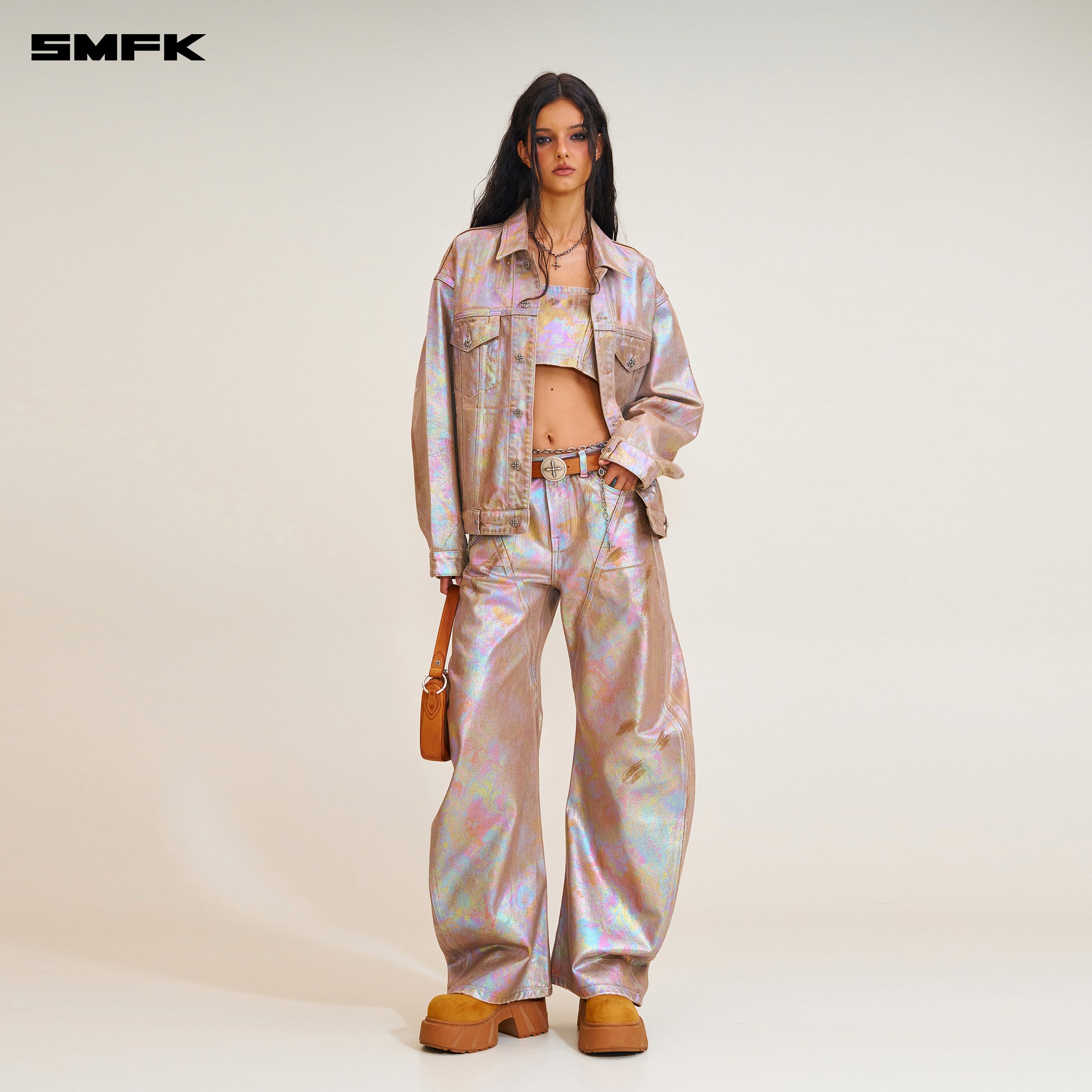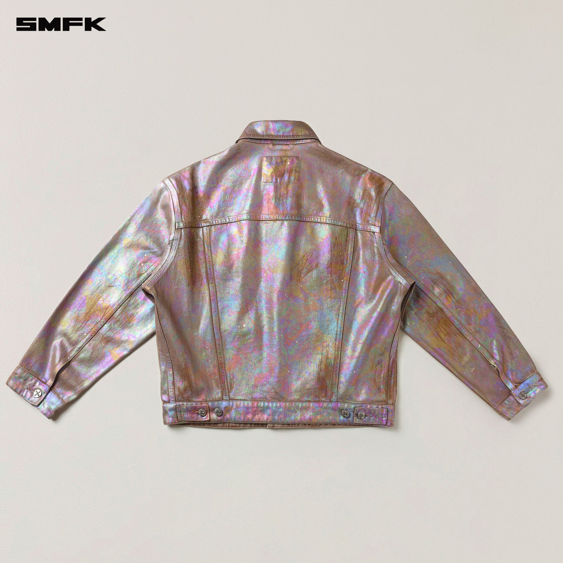 The SMFK classic oversized denim jacket in the RAGE handcrafted version features a garment coating technology where the entire assembled jacket undergoes heat-pressed iridescent coating after stitching. Under high temperature and heavy pressure, the coating gradually fuses with the fabric to create an entirely new material texture. The iridescent coating produces polarized color-shifting effects under different lighting conditions and color exposures.
