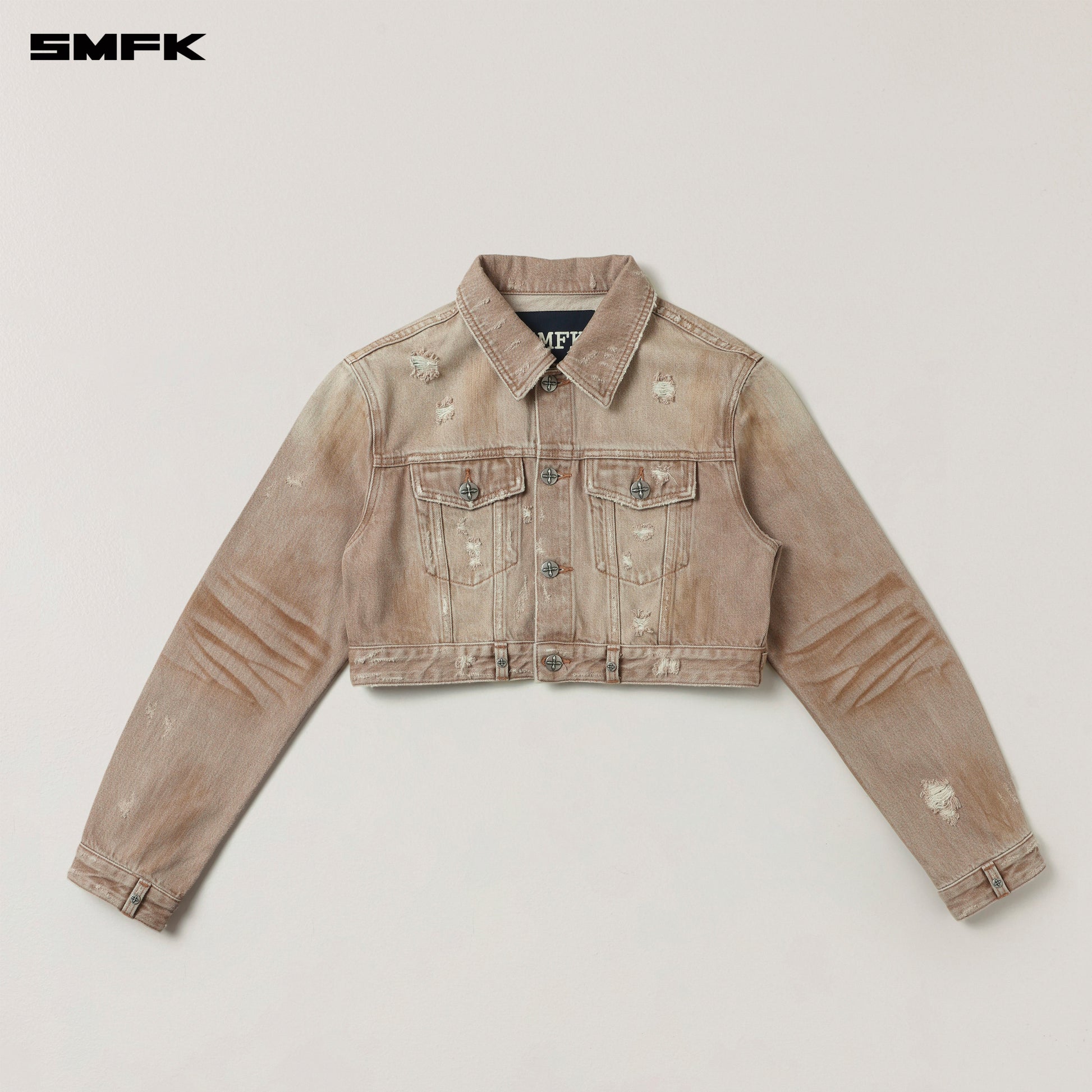 The SMFK cropped denim jacket in the RAGE handcrafted collection features SMFK's newly developed wilderness color system for denim, incorporating complete earth-toned denim fabric dyeing, weaving, washing, and hand-painted finishing techniques.
