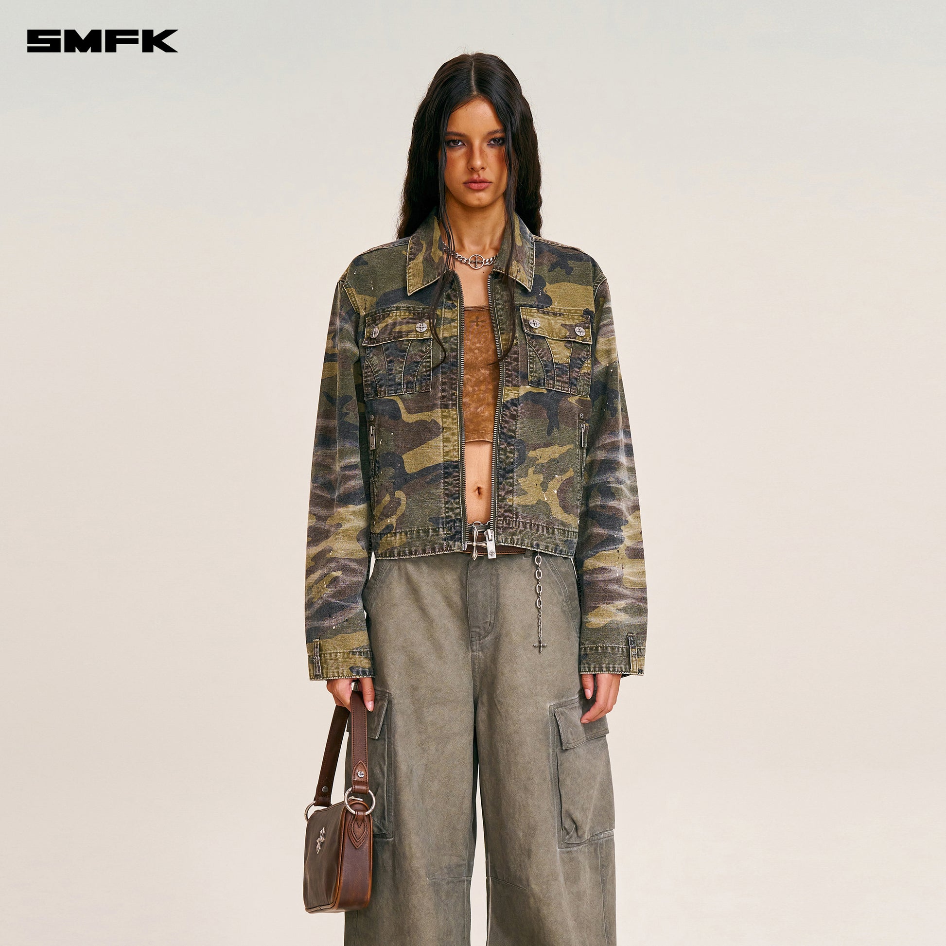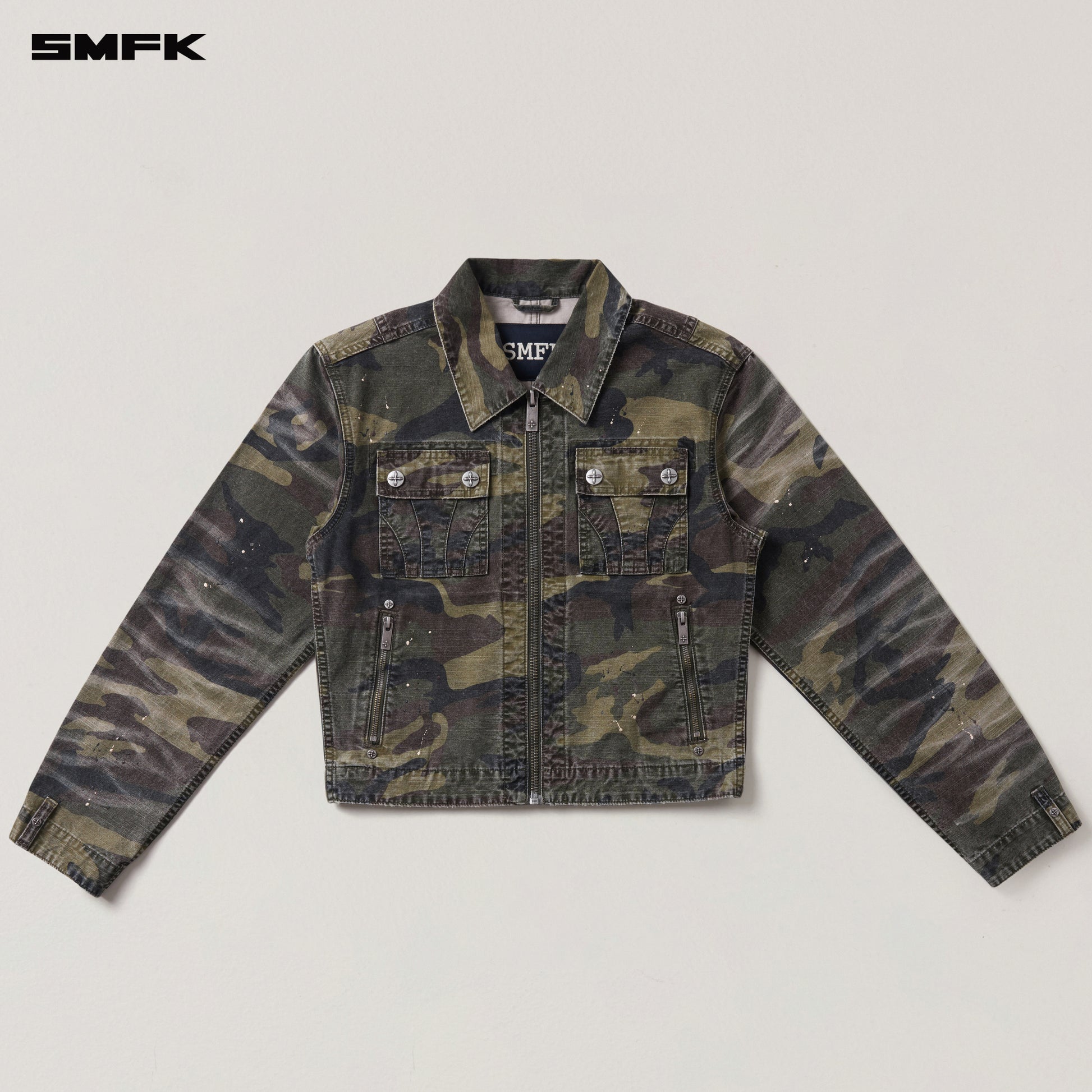 SMFK's RAGE Handcrafted Series, designed in 2025. Fitted utility jacket with a precise mid-length torso and signature SMFK elongated sleeve silhouette. Features three-panel back construction. Fine-grained military green camouflage utility cotton, manually distressed after natural sun-drying to emulate the rugged, authentic texture of workwear.
