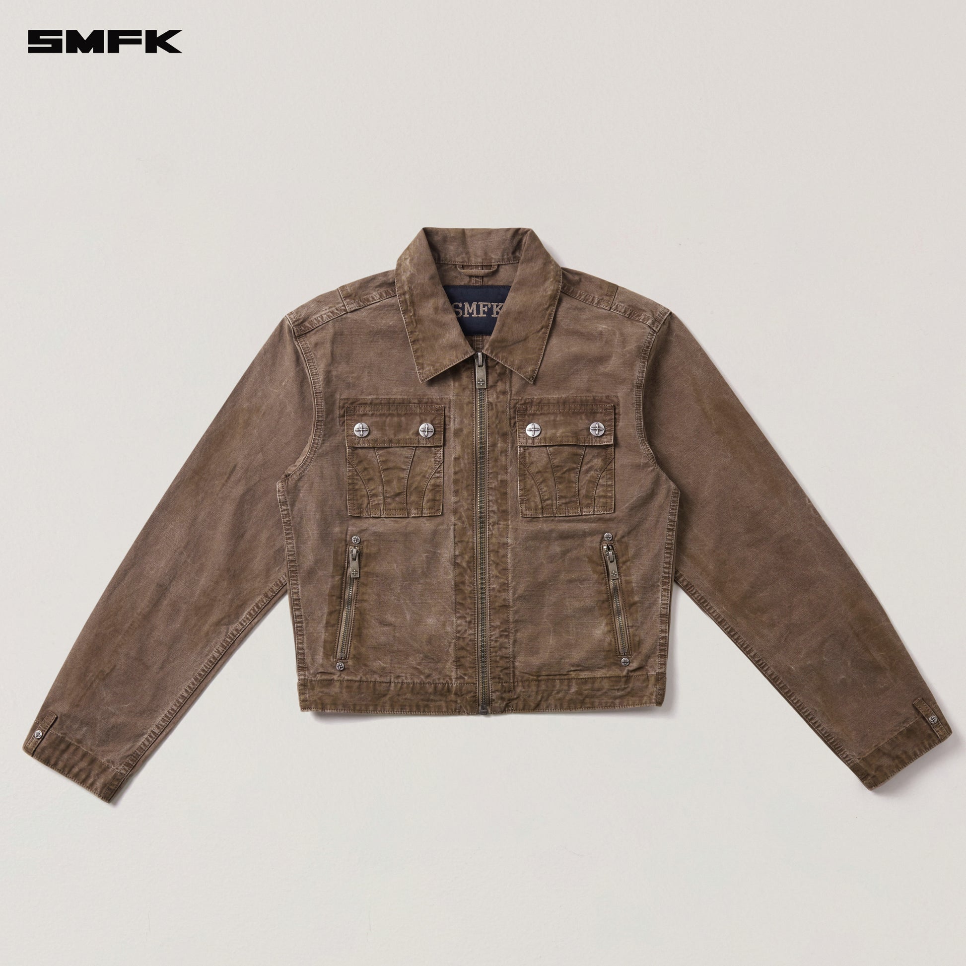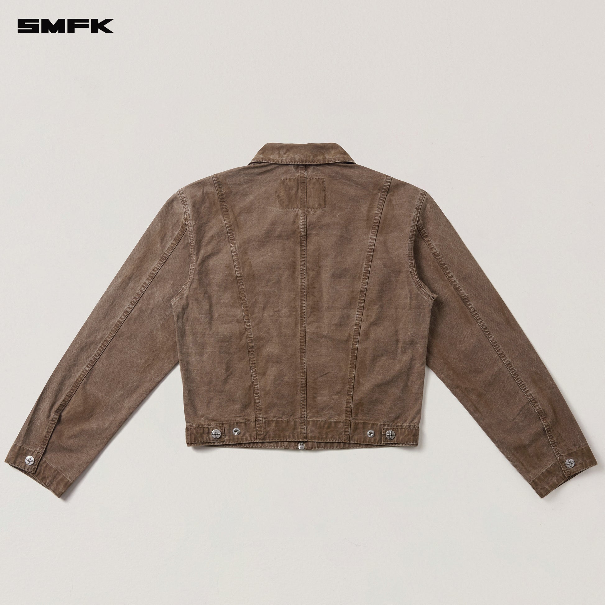 SMFK's RAGE Handcrafted Series, designed in 2025. Fitted utility jacket with a precise mid-length torso and signature SMFK elongated sleeve silhouette. Features three-panel back construction. Garment-hand-dyed with multiple wash-dye cycles, finished with manual distressing after natural sun-drying to emulate the rugged, authentic texture of workwear.