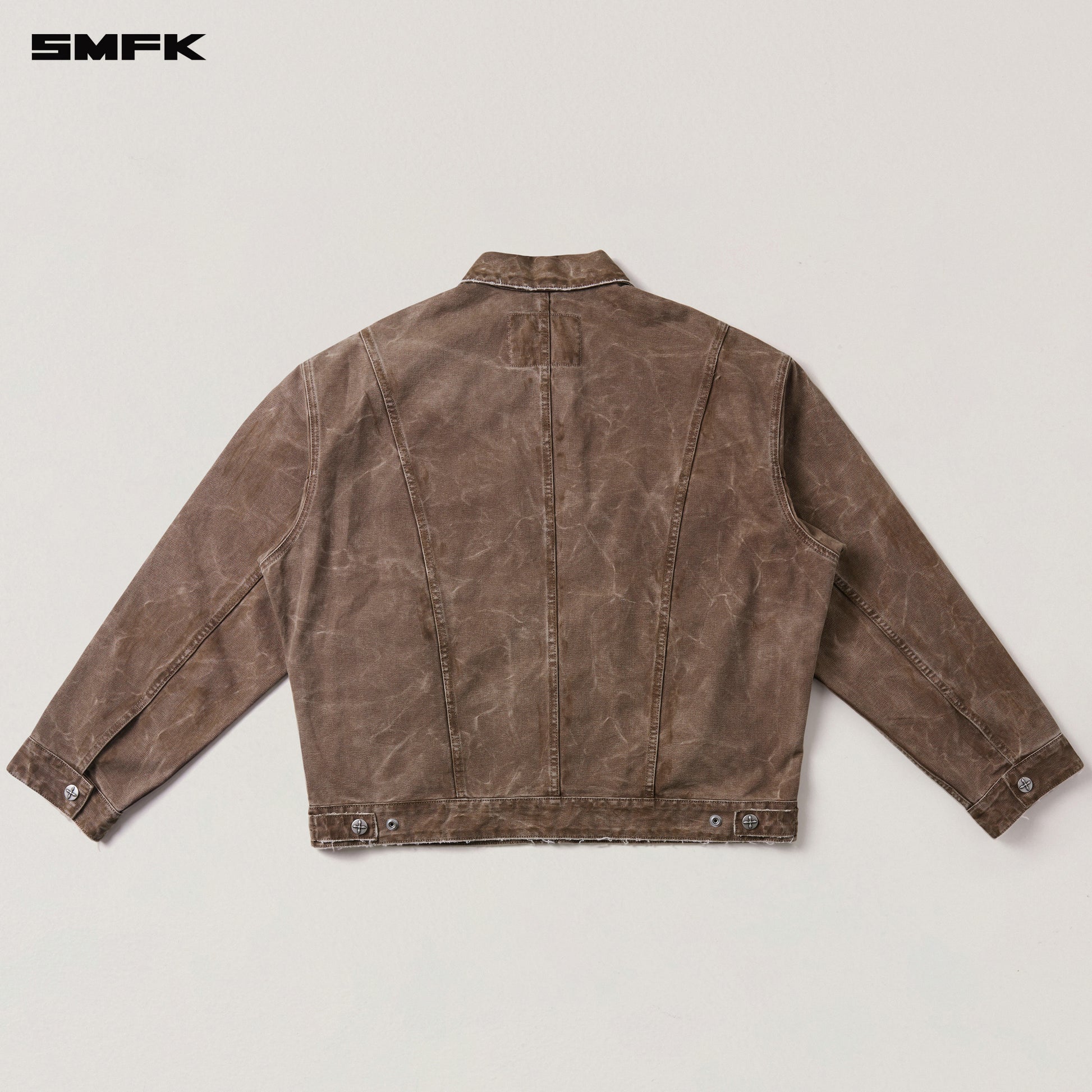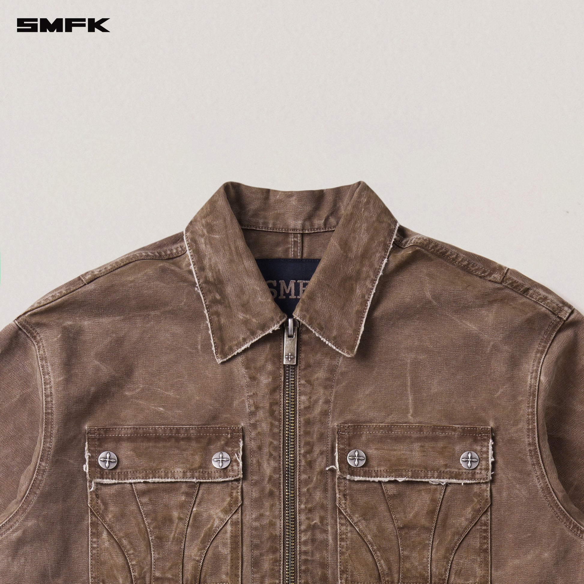 SMFK's RAGE Handcrafted Series, designed in 2025. Classic straight-cut utility jacket with a relaxed, boxy silhouette. Features three-panel construction at the back. Crafted from coarse-grained utility cotton, garment-dyed by hand, and finished with manual distressing after natural sun-drying to emulate the rugged, authentic texture of workwear.